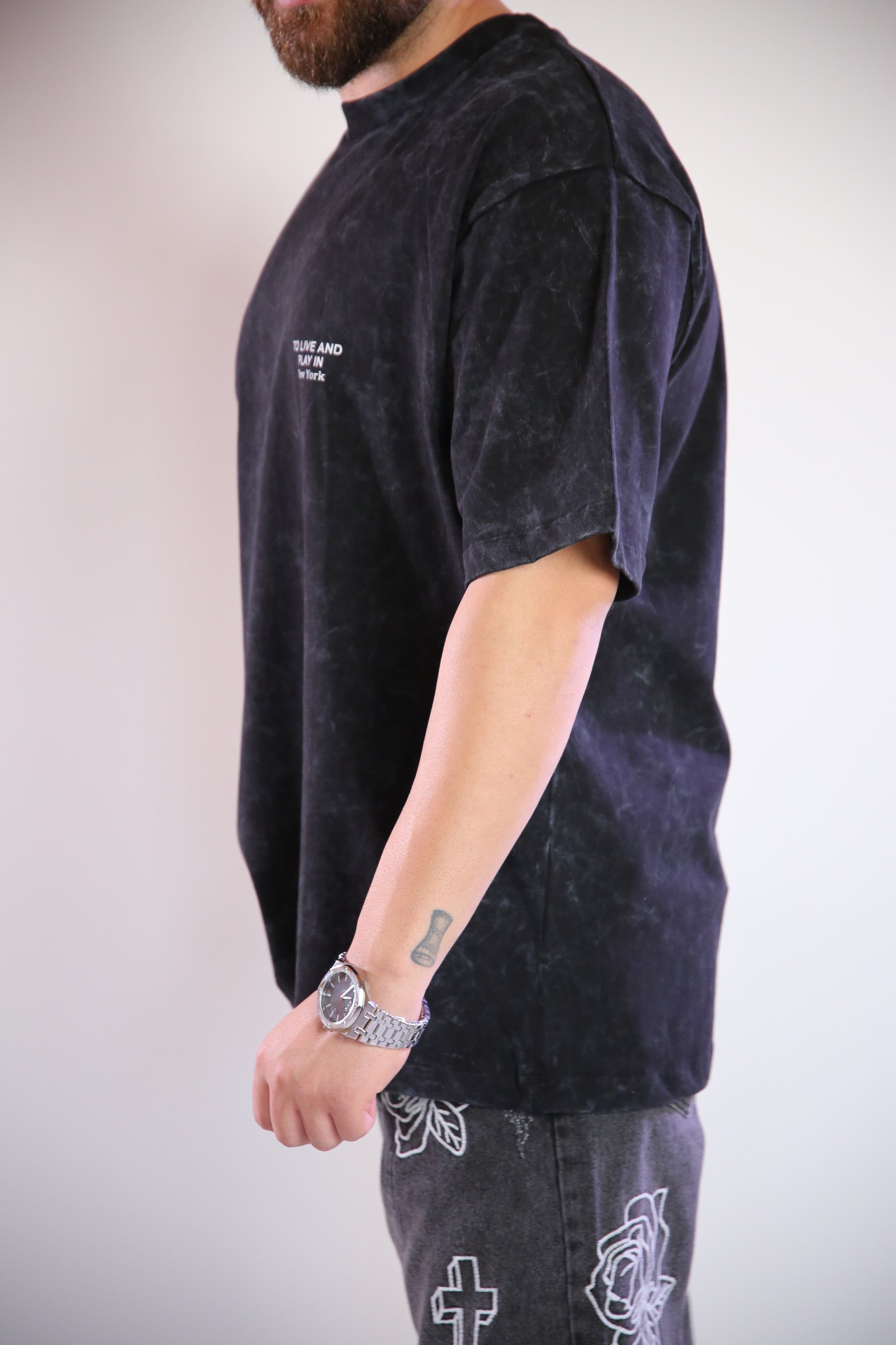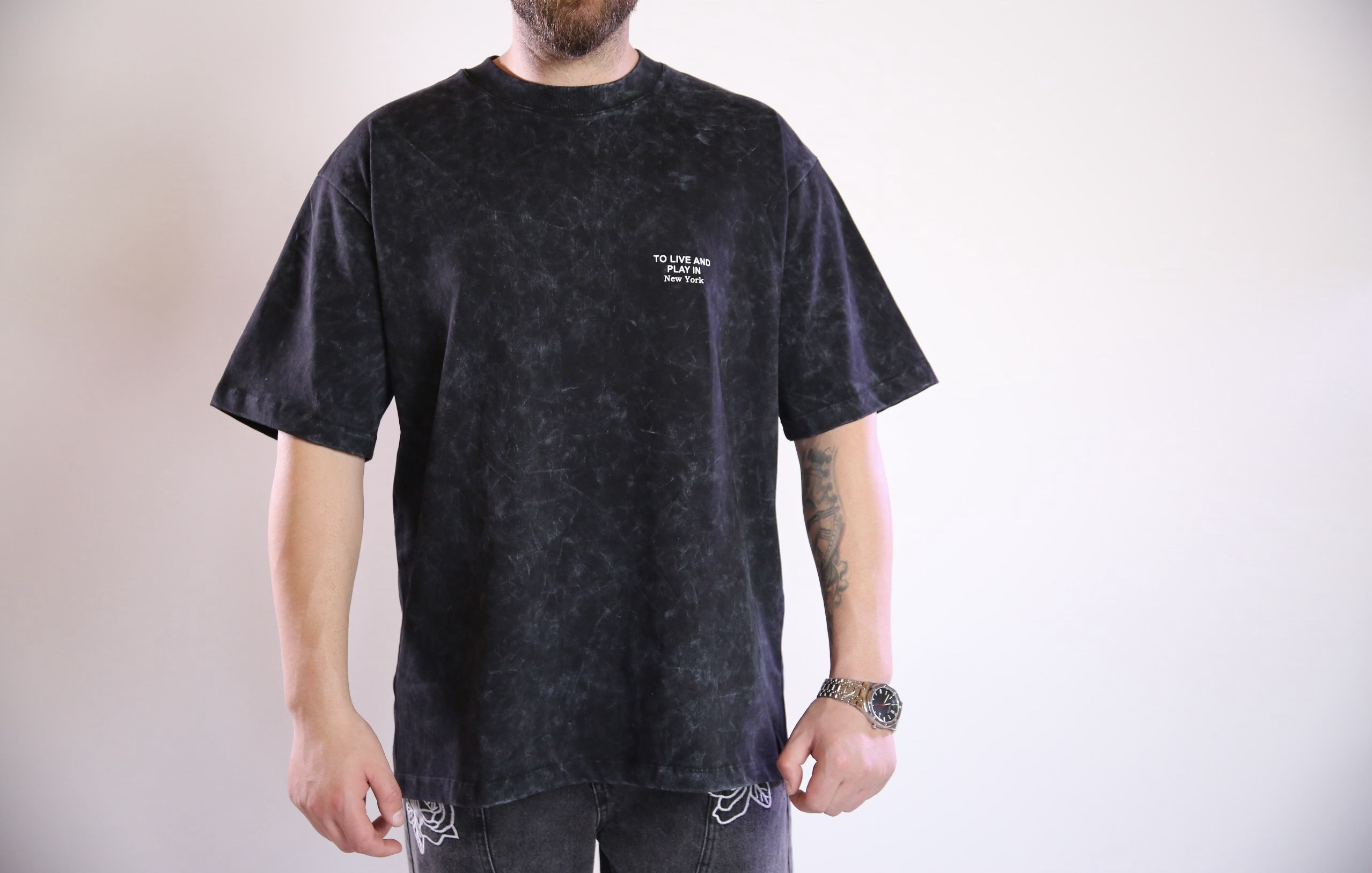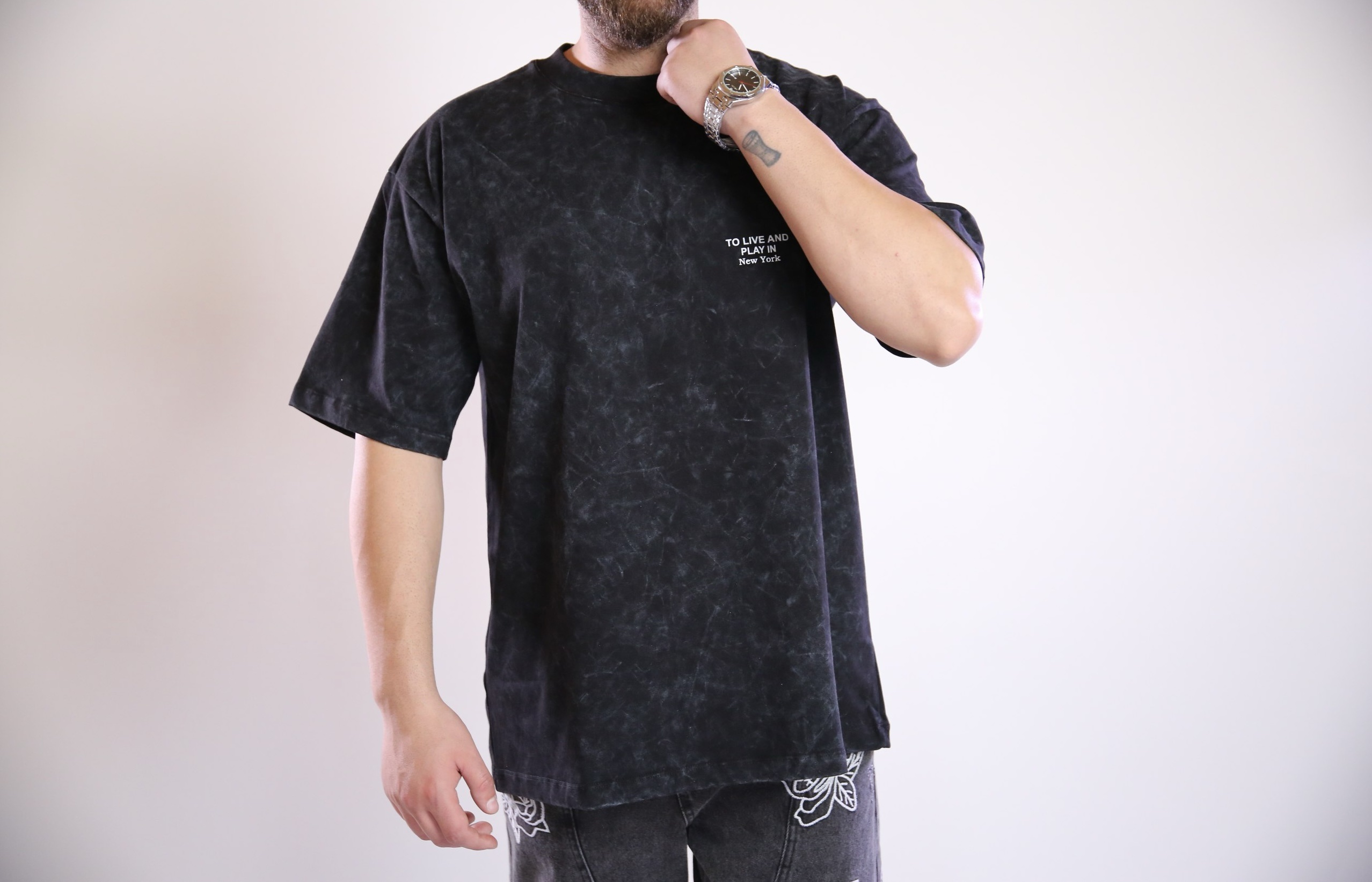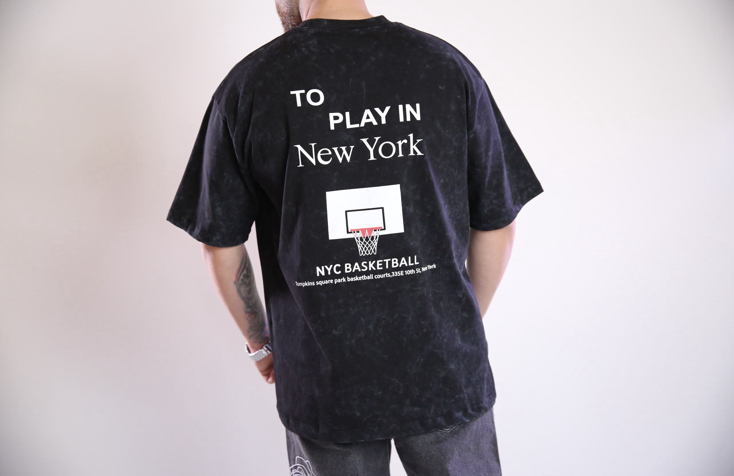 בקדמת החולצה מופיע טקסט מינימליסטי שמעביר את התחושה של העיר שלא נרדמת – לחיות ולשחק בניו יורק.