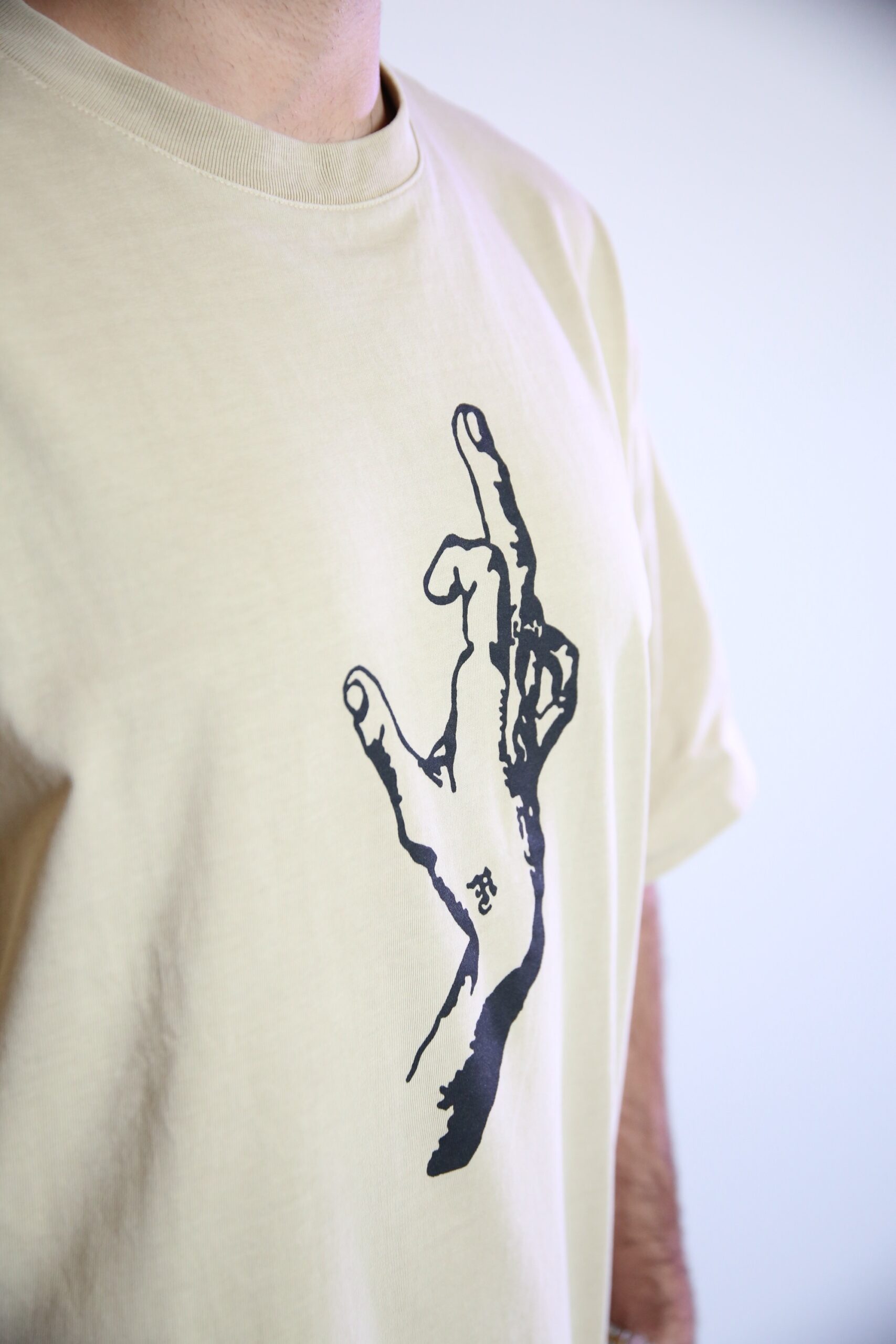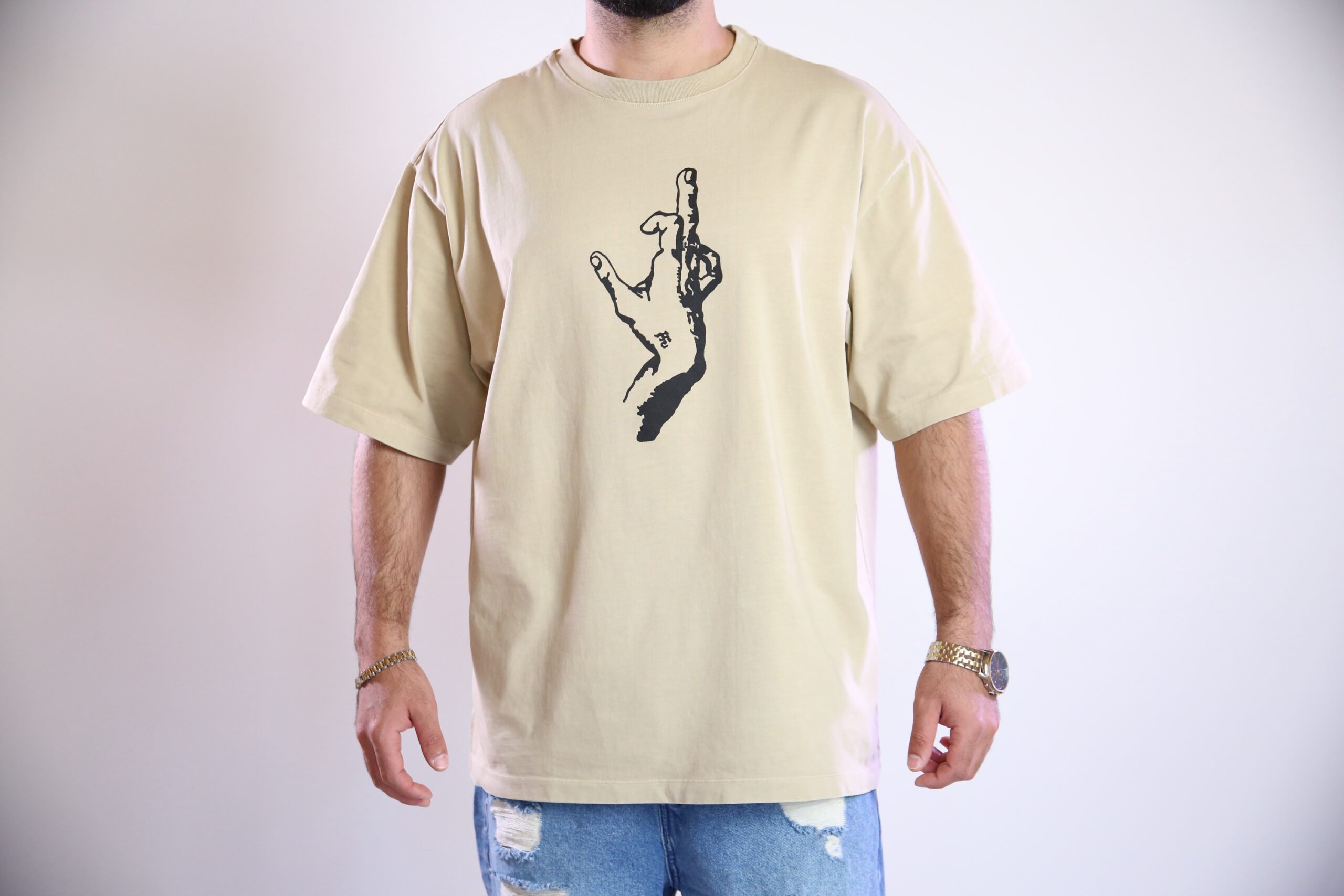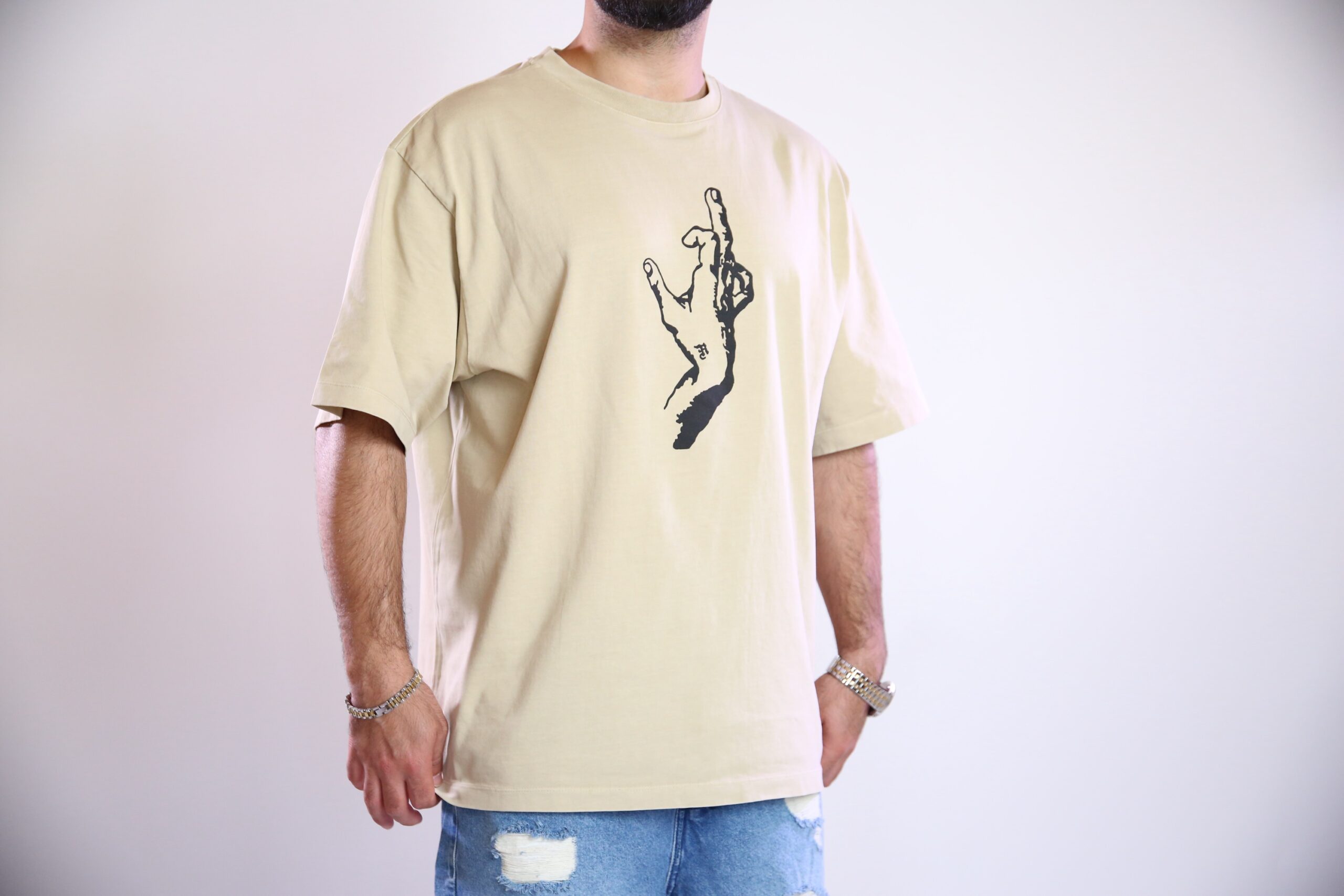 טי-שירט בצבע בז’ רך עם הדפס יד גרפית בולטת – מינימליזם עם אמירה. מתאים לכל מי שמעדיף לדבר דרך הסטייל.