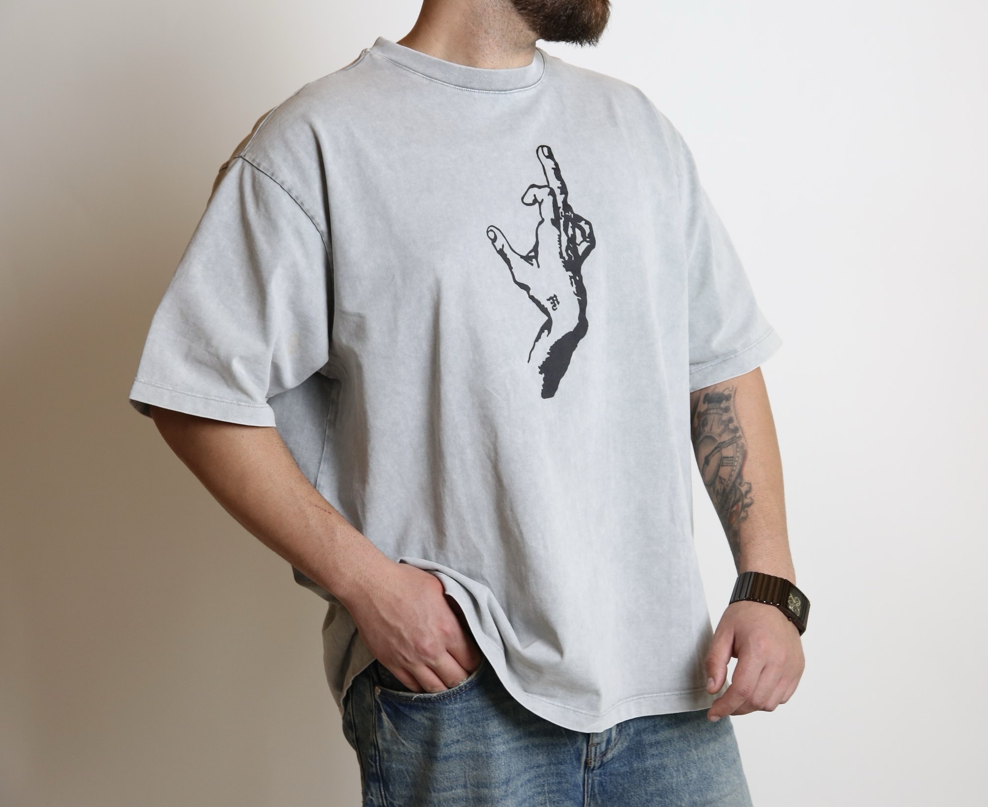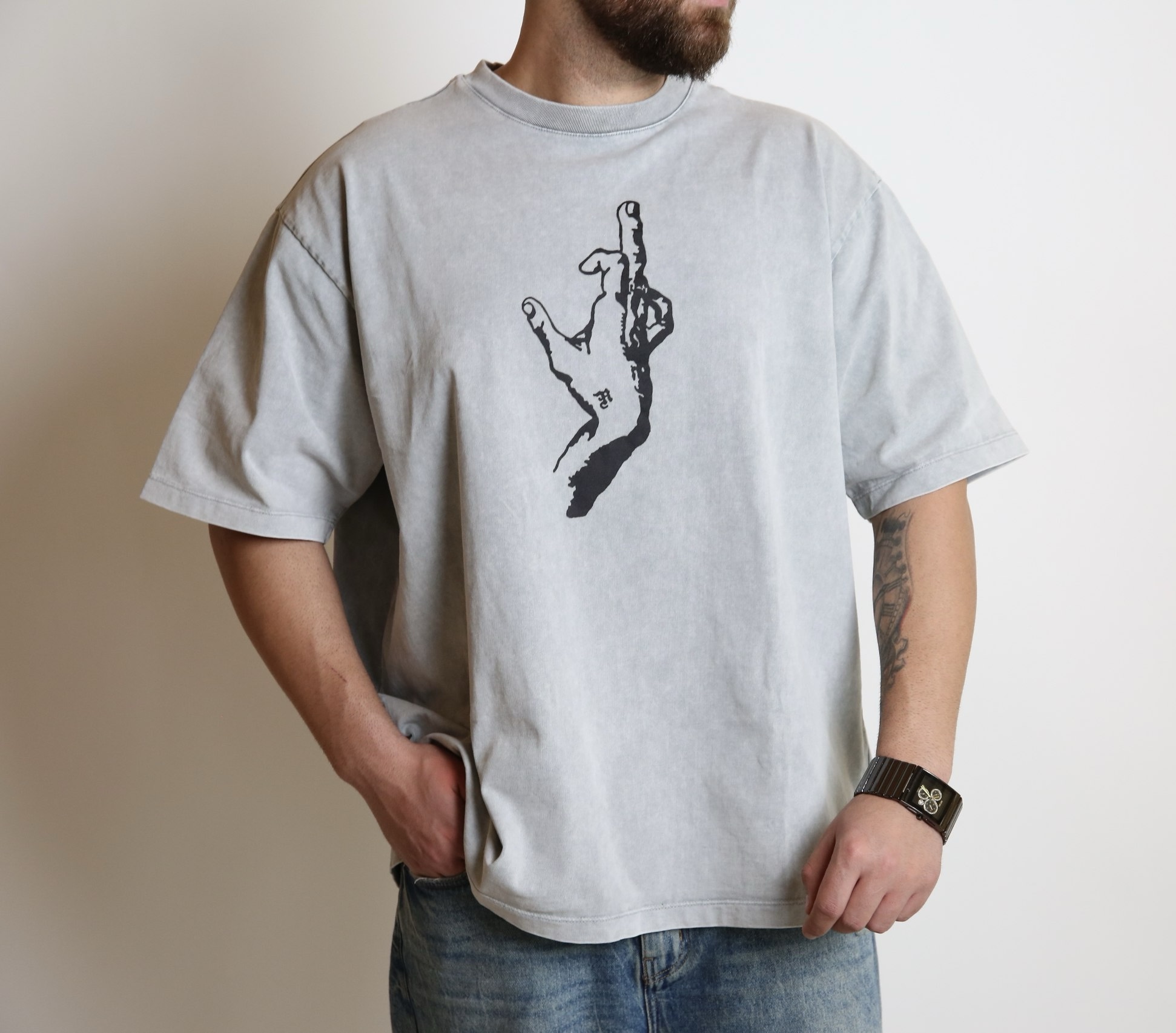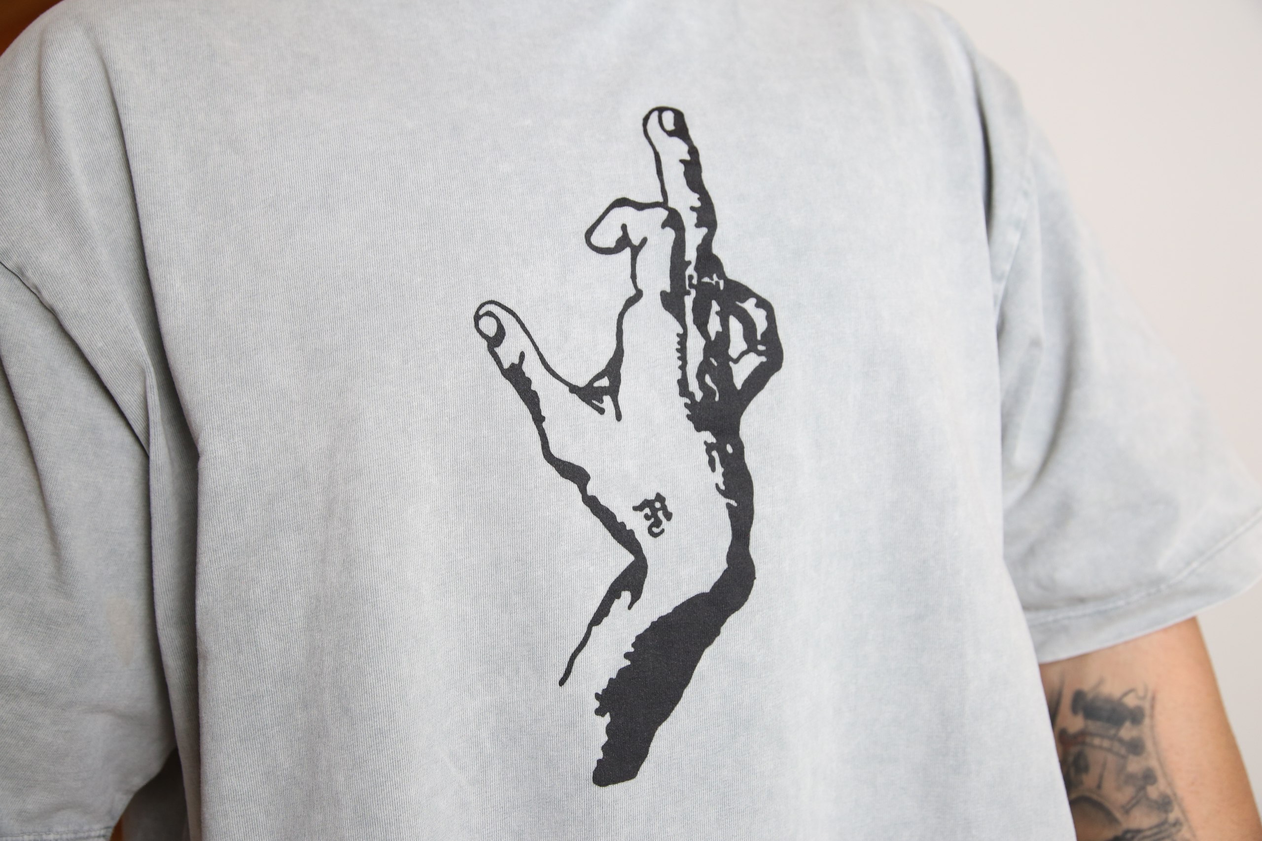 טי-שירט בגוון אפור וינטג’ עם הדפס יד ייחודי שמושך מבט. עיצוב נקי אך בועט, שמשאיר הרבה מקום לפרשנות – בדיוק כמו שצריך.